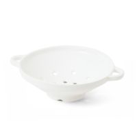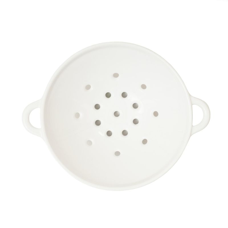 磁器でできたコランダー(ざる)は、高台があったり、両サイドに取手がついていたりと器としてもかわいらしい造り。
