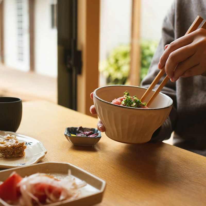 ネギトロ丼:ブロウ ボウル / 蓮根と大葉のはさみ焼き:アーリーバード オーバルプレートL / トマトと新玉ねぎのサラダ:ペイヴ 4.5寸皿(生成) / お漬物:隅入菱形 豆皿(ダミ) / お茶:鎬文 丸湯呑み(藍鼠) / お箸:(大豆色)