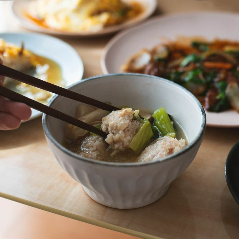 鶏団子スープ:ブロウ ボウル / 天津飯:オルス 210プレート(シェルピンク・アイスブルー) / レバニラ:オルス 270プレート(シェルピンク)