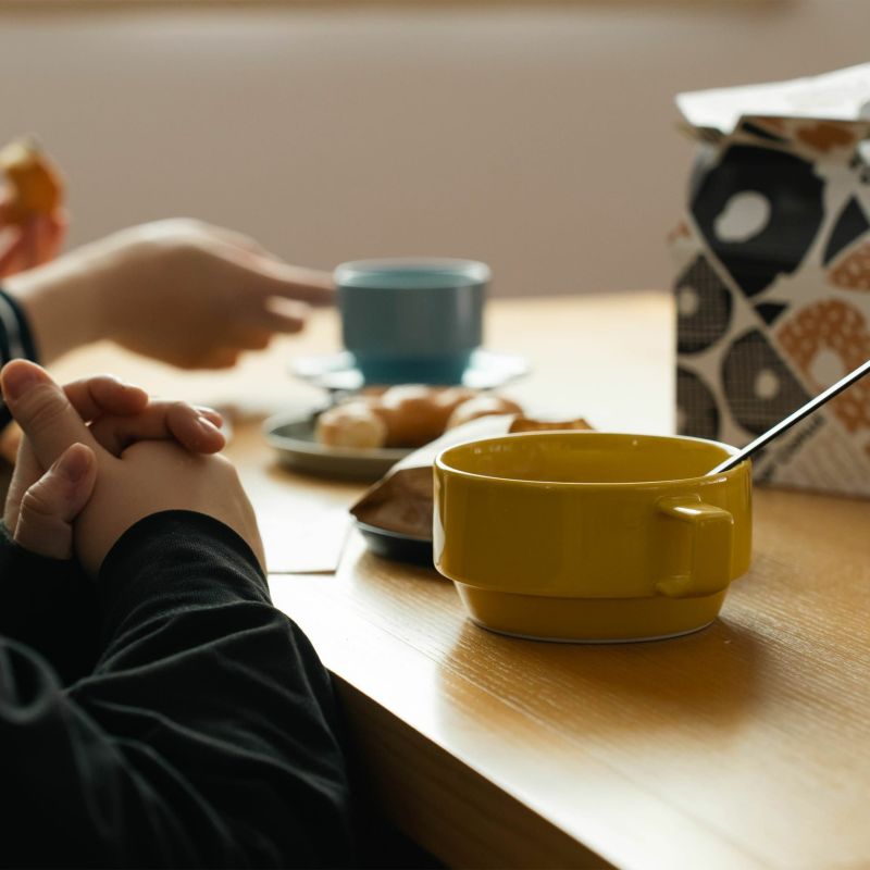 重ねて収納できるスタック性能、生地が厚めに形成されていることによって密度が高く頑丈なボディ、口当たりのやさしいエッジ、そして洗いやすさを考えたカップ内側の丸い仕上げ。