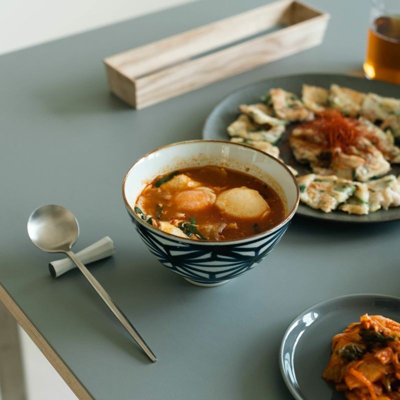 参鶏湯:いろは 丼(菊文) / スンドゥブ:いろは 丼(麻の葉) / ナムル: リアン 焼物皿(藍) / チヂミ:オルス 270プレート (ダークグレー) / チヂミのタレ:オルス 150ボウル(ダークグレー) / キムチ:SEASON 01 プレートミニ(グレー) / グラス:スタッフ私物