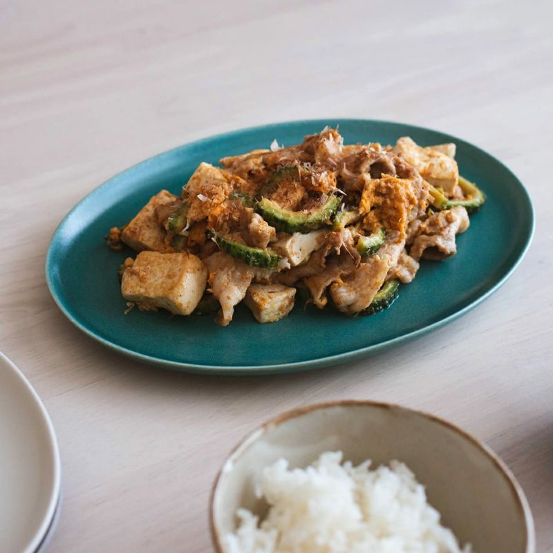 ゴーヤチャンプル:パレット 290プレート(トルコグリーン) / 白米:ブルジョン ライスボール小(白)