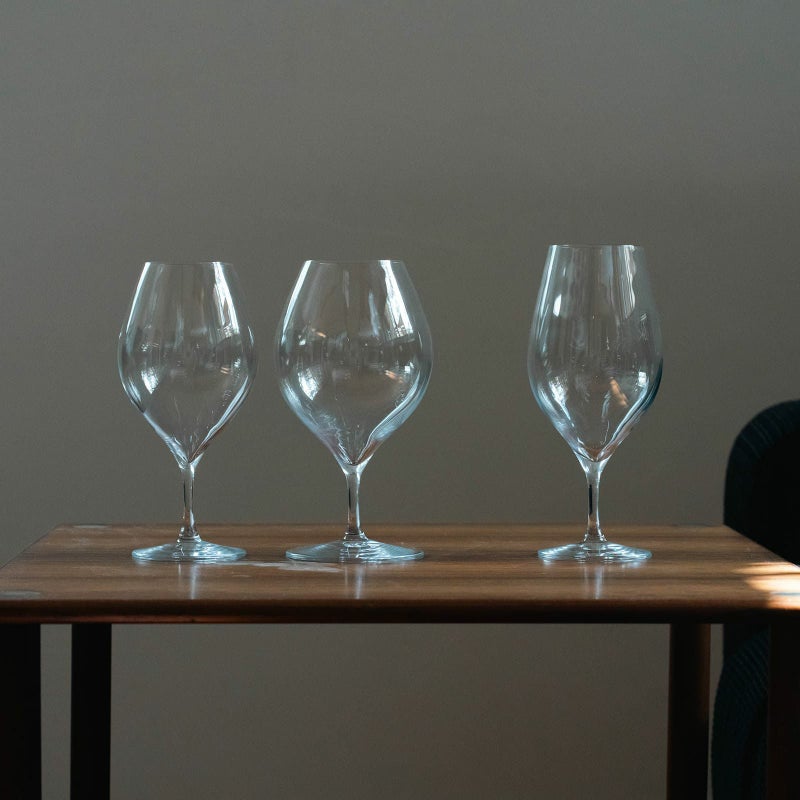 さらにいうと、口径が狭いものは「ボルドー型」。広いものは「ブルゴーニュ型」に分類され、前者が渋みの強い赤ワイン向け、後者が酸味の強い赤ワイン、もしくは白ワイン向けとも言われています。(本当はもっといろいろ細かくありますが、あくまでも大まかに…。ワインの世界は奥が深いですね…。)