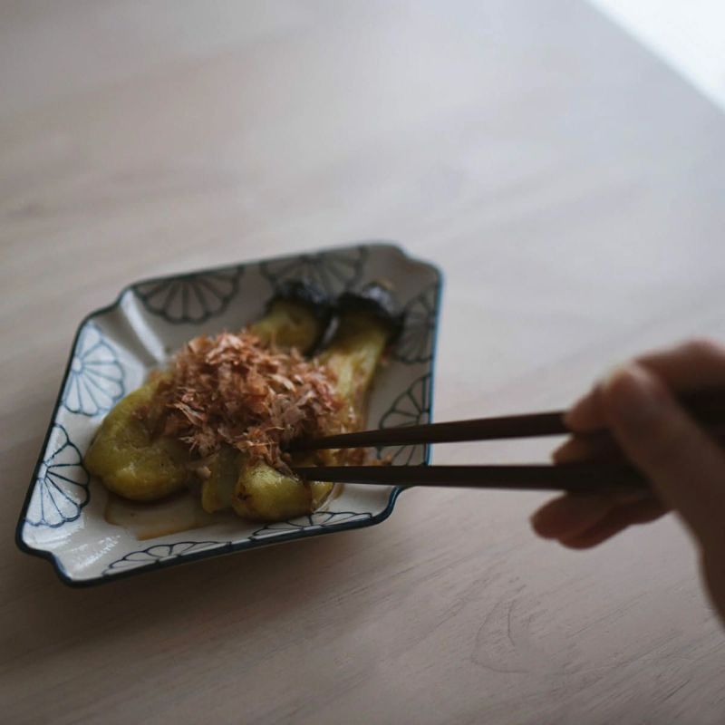 焼き茄子:隅入菱形皿(ダミ) / お箸:(栗皮色)