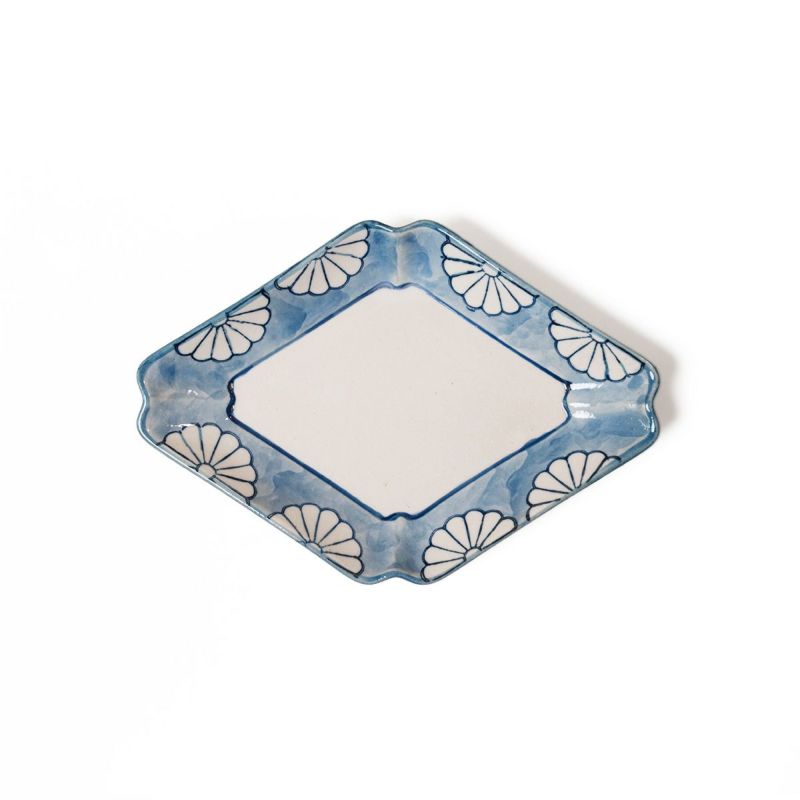 古風な菊花模様が絵付けされた隅入菱形皿は上品ながら、焼成の際に生じる鉄粉混じりの土が温かみや素朴さを与え、親しみやすさを感じます。