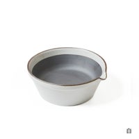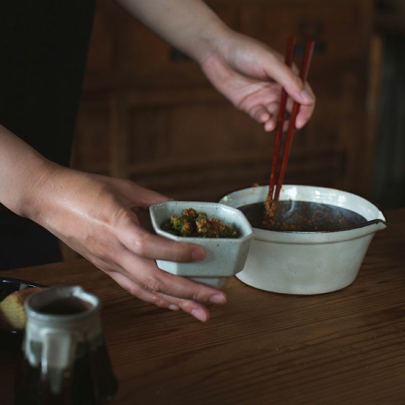 片口のように注ぎ口が付いているので、我が家では豚カツの日にも大活躍。すりたての香ばしいごまの半分は味噌に、もう半分には直接ソースを加えていただきます。