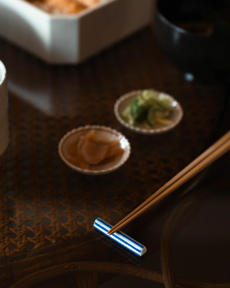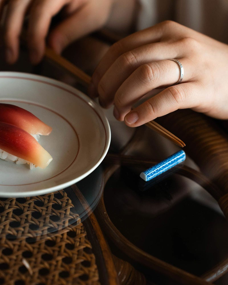 東屋の「印判箸置き」は、その名のとおり、印判という古い技法で模様が染めつけられています。