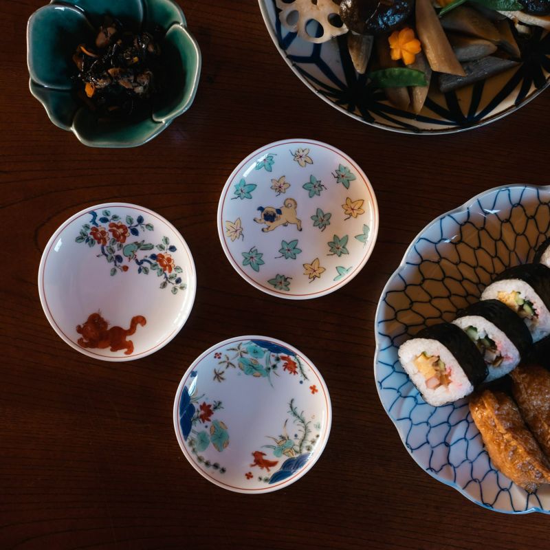 【左から】色絵 そば猪口 (パグ・ウーパールーパー・コンゴウインコ・エキゾチックショートヘア)