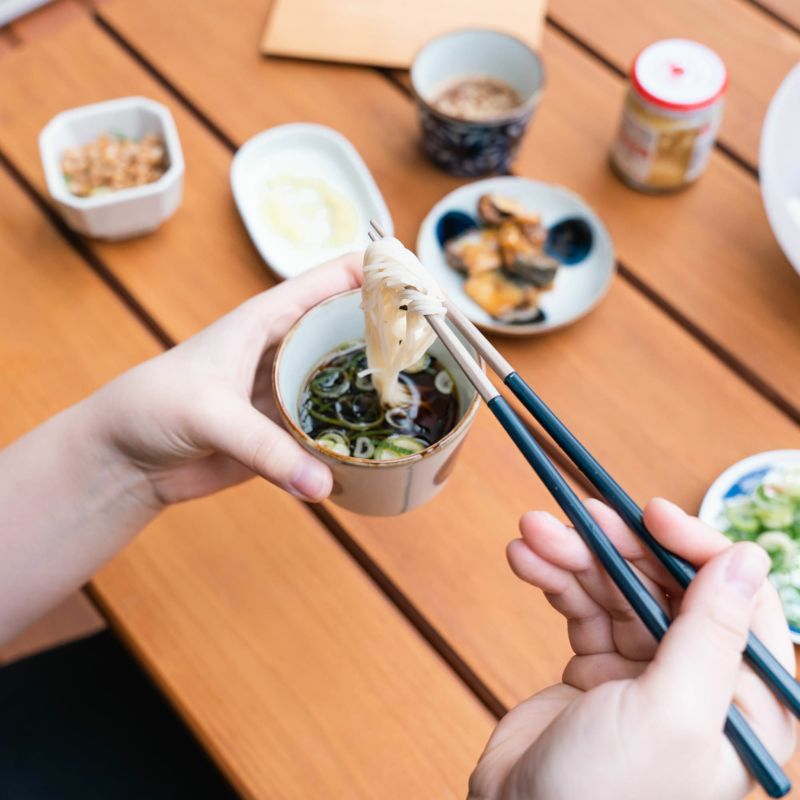 そばつゆ:いろは そば猪口 / そうめん:吹雪 大鉢 / 納豆: ペイヴ 3寸小鉢(木成) / 生姜のすりおろし:しょうがのおろし器(白) / 箸:SEASON 01 箸(マスタード・ホワイト・ネイビー)