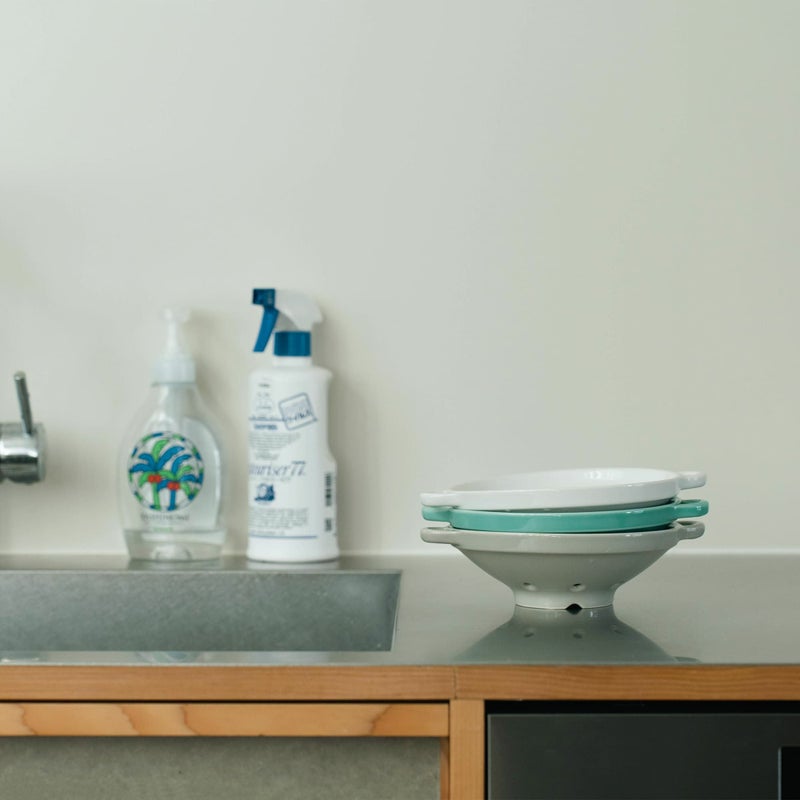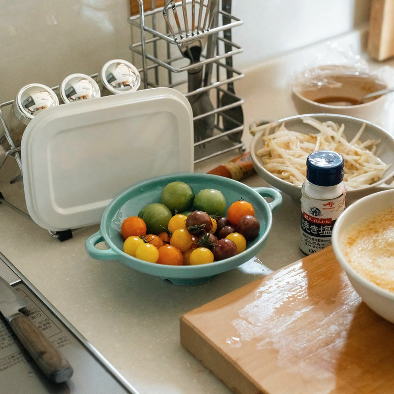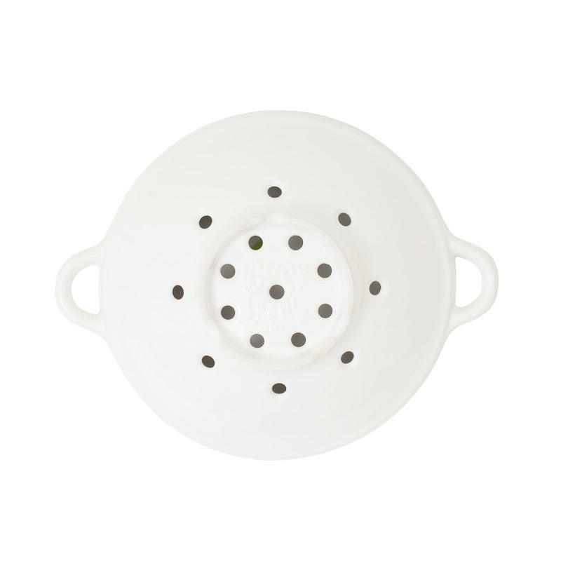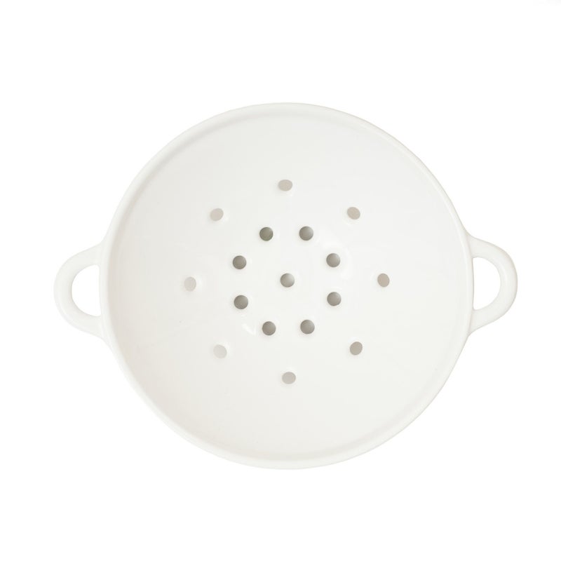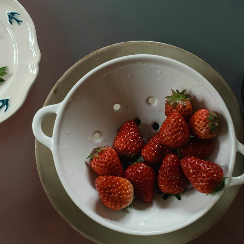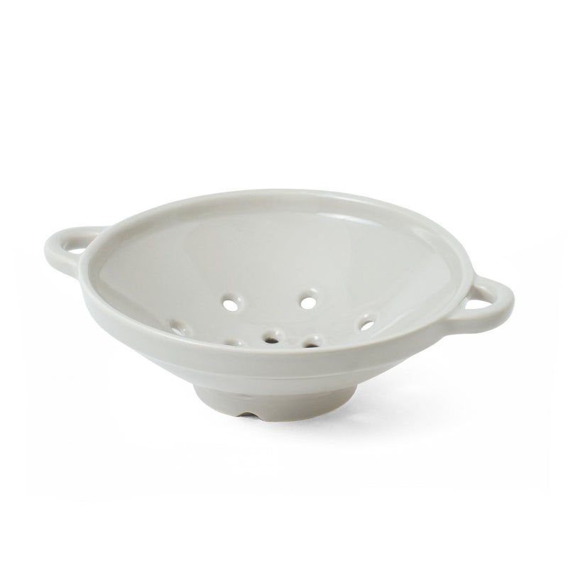 磁器でできたコランダー(ざる)は、高台があったり、両サイドに取手がついていたりと器としてもかわいらしい造り。