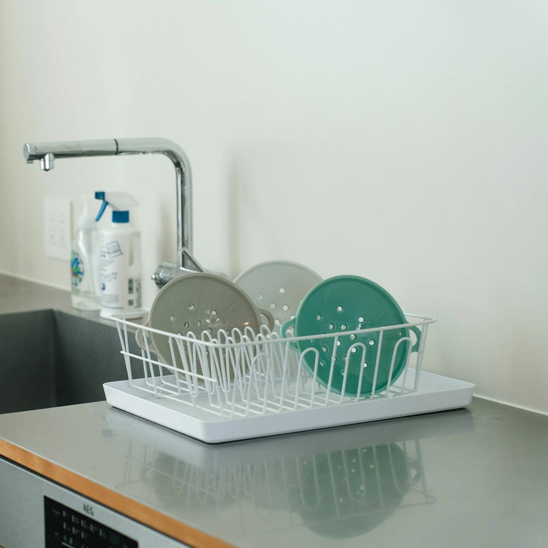 3色とも落ち着いた色味で、水切りに置きっぱなしでも フックにかけてもキッチンに馴染みます。