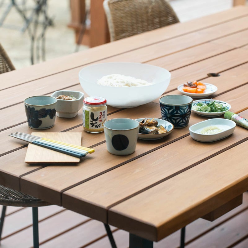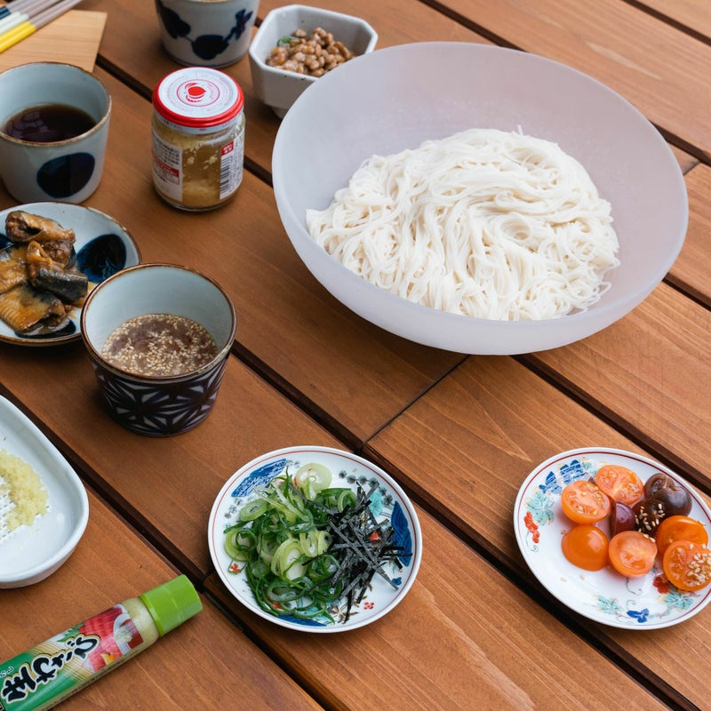 そうめん:吹雪 大鉢 / そばつゆ:いろは そば猪口 / 納豆: ペイヴ 3寸小鉢(木成) / 生姜のすりおろし:しょうがのおろし器(白) / いわしの生姜煮:いろは 小皿(丸文) / プチトマト:色絵 小皿(ピグミーヘッジホッグ) / 薬味:色絵 小皿(ウーパールーパー) /箸:SEASON 01 箸(マスタード・ホワイト・ネイビー)
