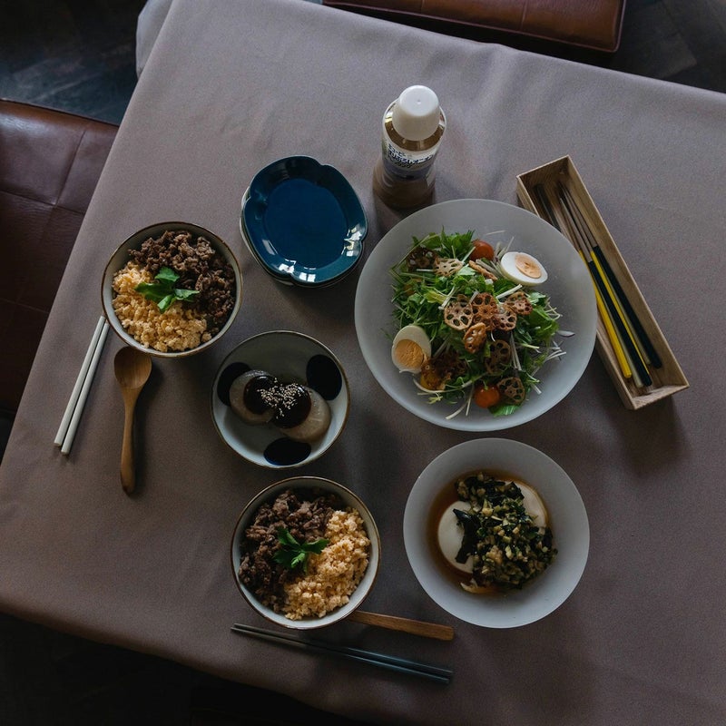 サラダ: 吹雪 大鉢 / 冷奴とだし: 吹雪 多用鉢 / そぼろ丼:いろは 丼(丸文・麻の葉) / 大根の田楽:いろは 中鉢(丸文) / 箸:SEASON 01 箸(ホワイト・ネイビー) / 取り皿:リアン 取り皿(藍) /スプーン:スタッフ私物