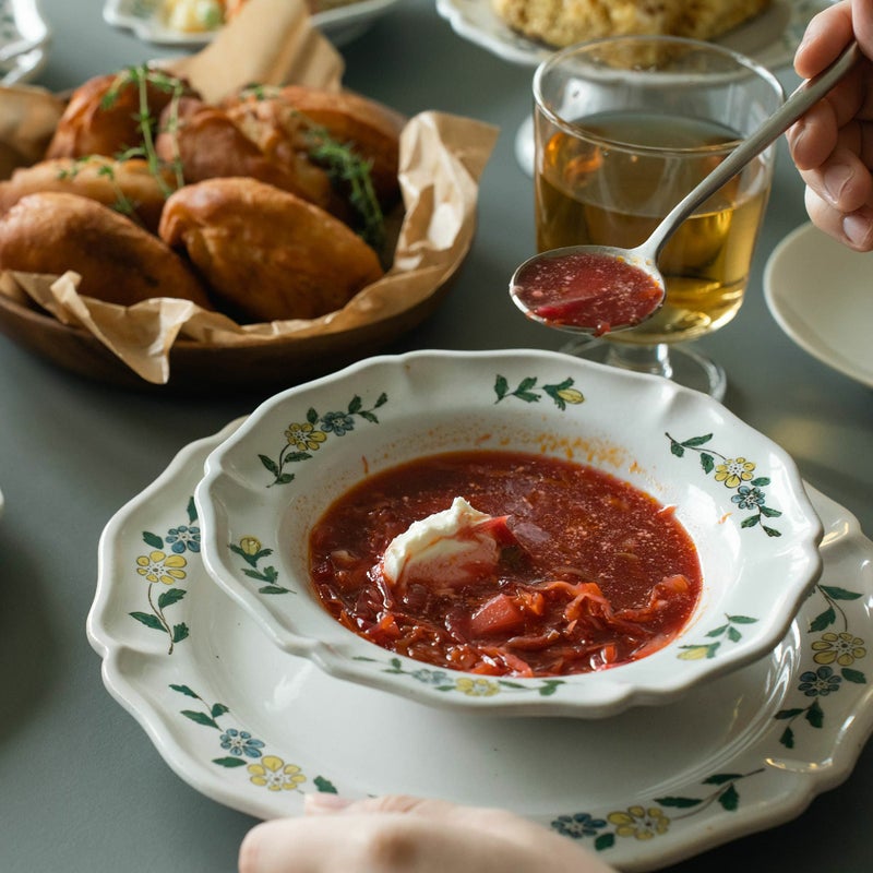 ボルシチ:ラヴィゴット 180ボウル / ソーサー:ラヴィゴット 240プレート / ピロシキ・グラス・カトラリー:スタッフ私物