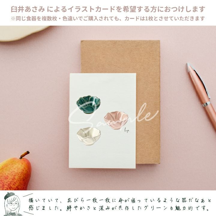 花びらの立体感・淡い優しい色合い・おかずをいれたときの主張しすぎない上品な存在感。本当に、どれをとっても素晴らしいのです。