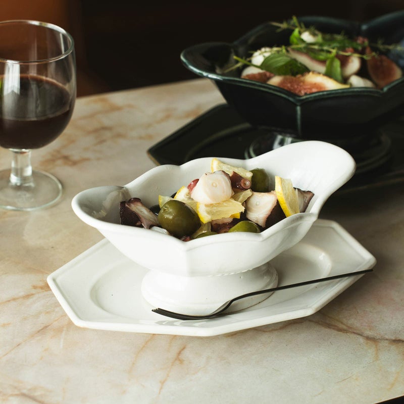 いちじくのカプレーゼ:トレトゥール ボウルL(濃藍)・トレトゥール プレートL(濃藍) / タコとオリーブのバジルサラダ:トレトゥール ボウルS(白)・トレトゥール プレートS(白) / 赤ワイン:ガウディ 6oz