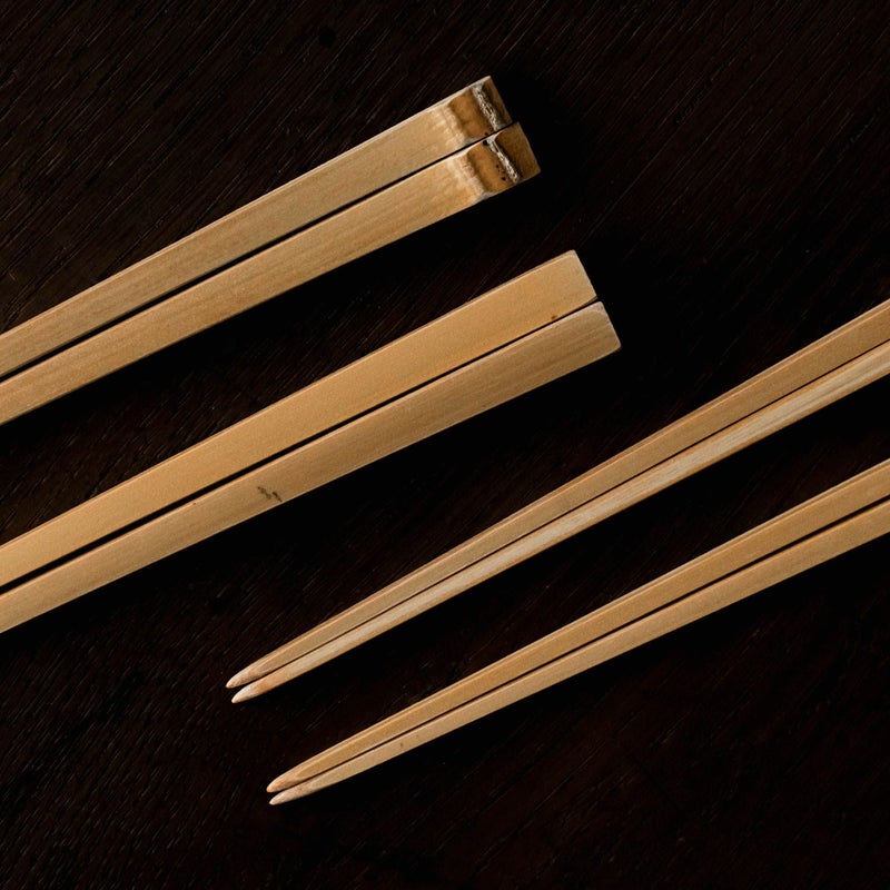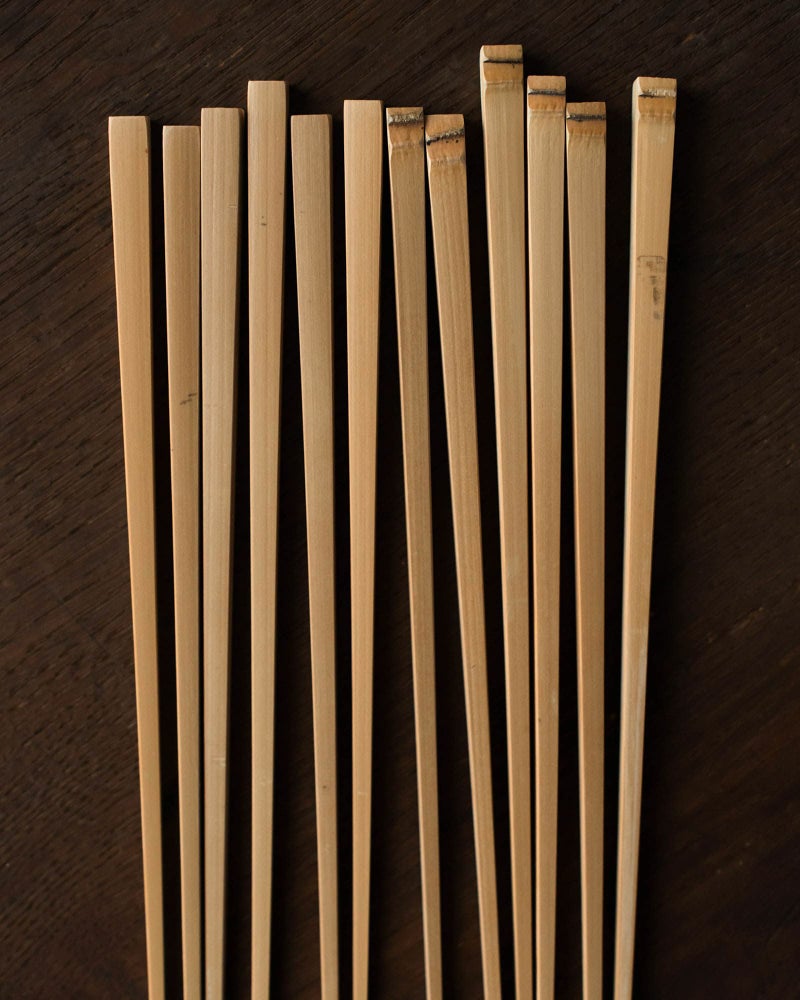 素材の特性を活かし、極限まで細く仕上げられた竹箸。揃えたときに二本がぴったりと合うのが大変気持ちよく、「端正」という表現がこの上なくしっくりくる素晴らしい佇まいです。