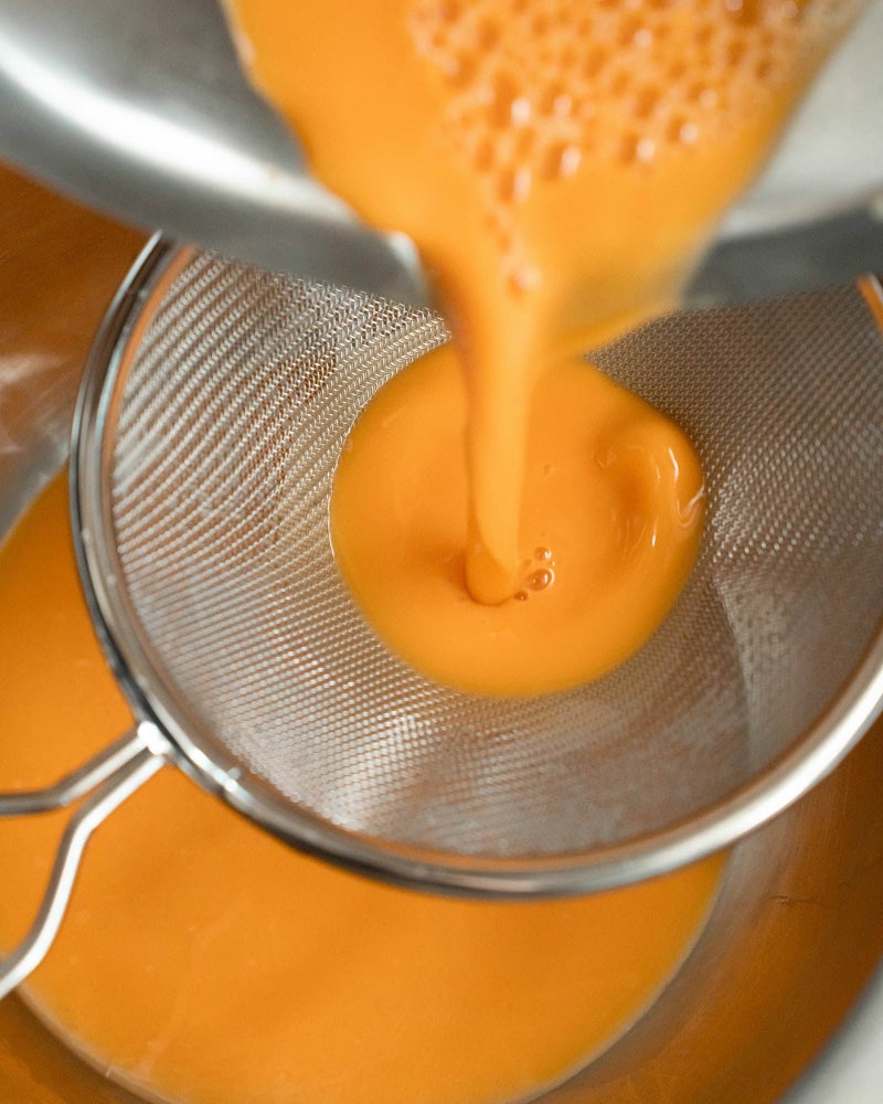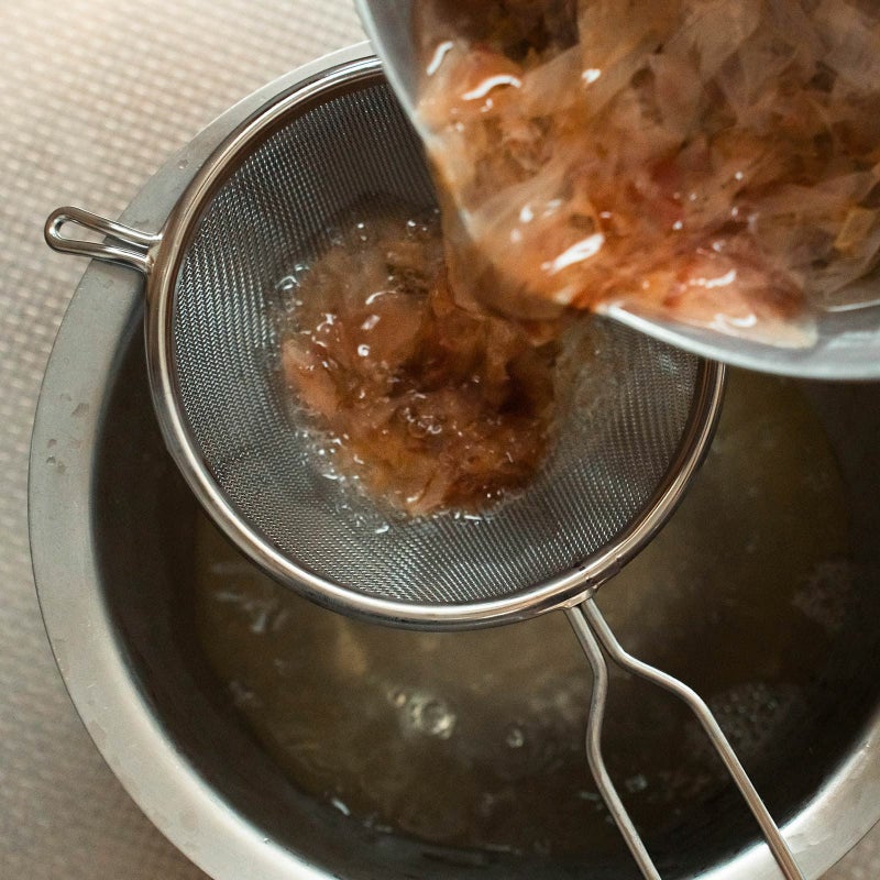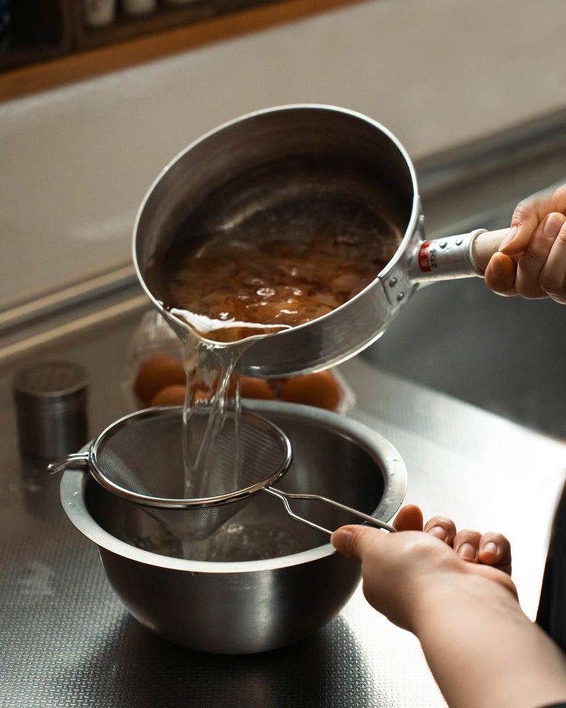 網は30メッシュ(=1インチあたり30個の網目)とかなり細かく、だしや卵液はすっと通しながら、余分な繊維や白身はしっかりキャッチ。