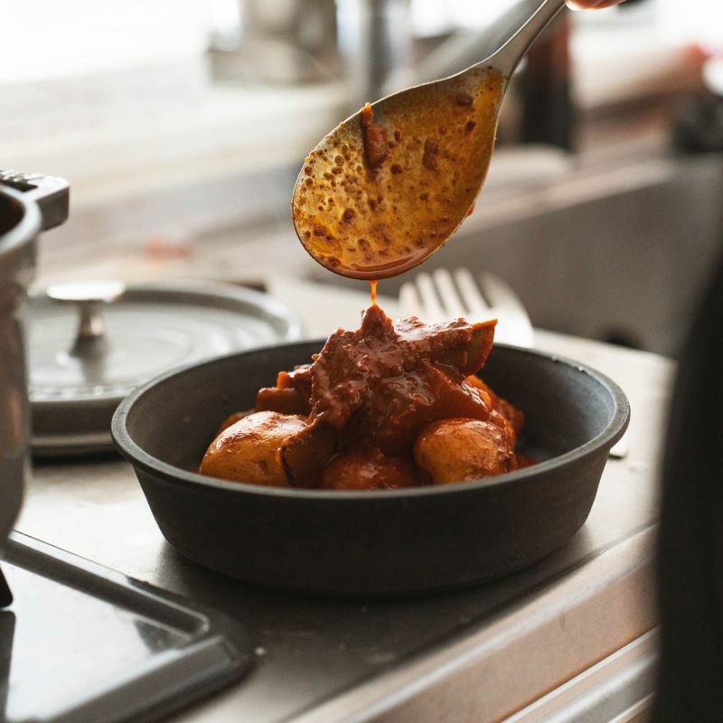 スプーンとフォーク同時に使うことでトングのような役割も。崩れやすく柔らかい具材もそっと盛り付けることができます。