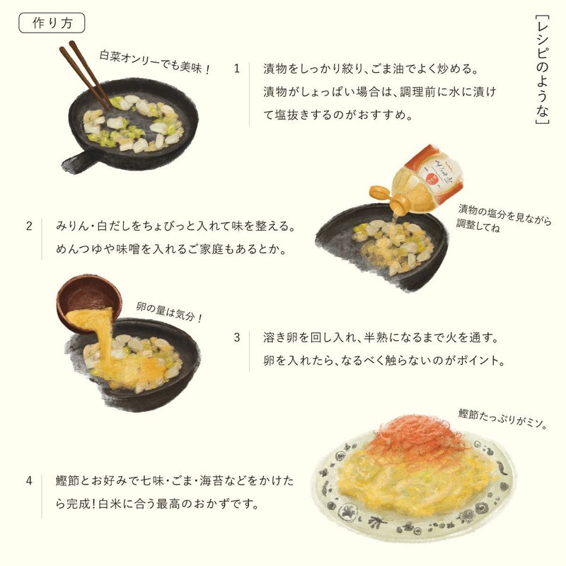 浅漬けを炒めて、お好みで味をつけて卵で閉じるだけの簡単レシピですが、このちょっとした手間でお米がもりもり進むおかずに大変身。
