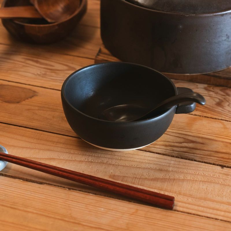 土鍋に合うよう陶器のあたたかみは残しつつ、強度を高めるため磁器も混ぜ込んだ半磁器製のれんげ。
