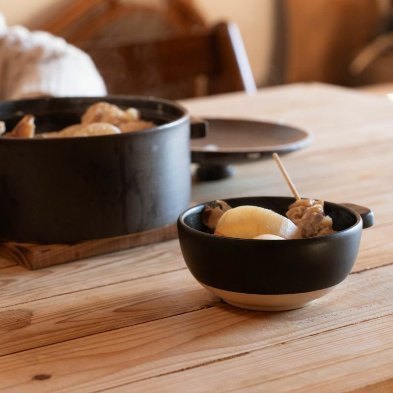 ちょっと角張った取手は 同じくかもしか道具店の「ご飯の鍋」と同じデザインだそうで、マットな質感の釉薬もおそろいです。