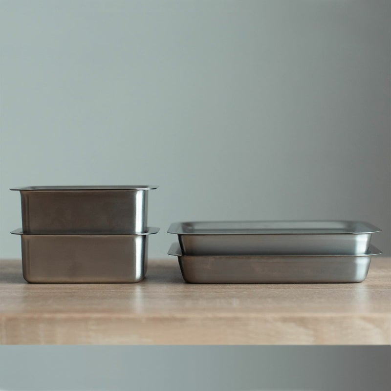 コーナー部分には段加工も施されているため、同サイズであれば本体の底がトレーのくぼみにぴったりはまり、重ねても外れにくくなっています。もちろん同サイズでなくてもスタッキングは可能です。