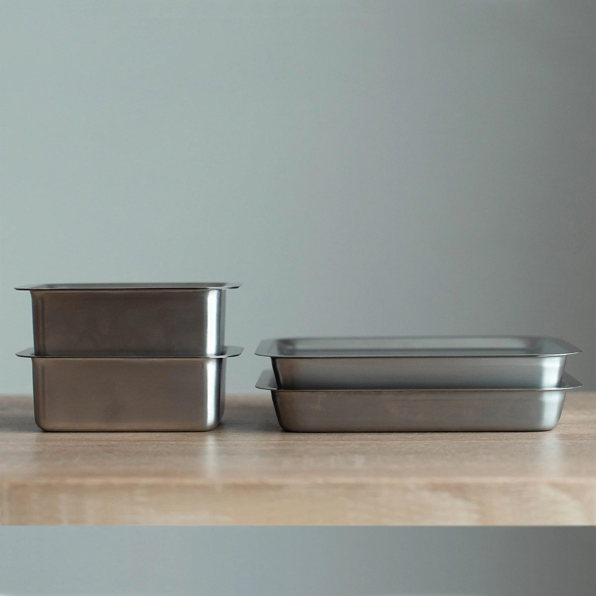 同じサイズを重ねられるのはもちろんですが、大きいサイズのセットの中にはそれぞれ小さいサイズがすっぽりと収まるので、収納サイズは最低限で済みます。