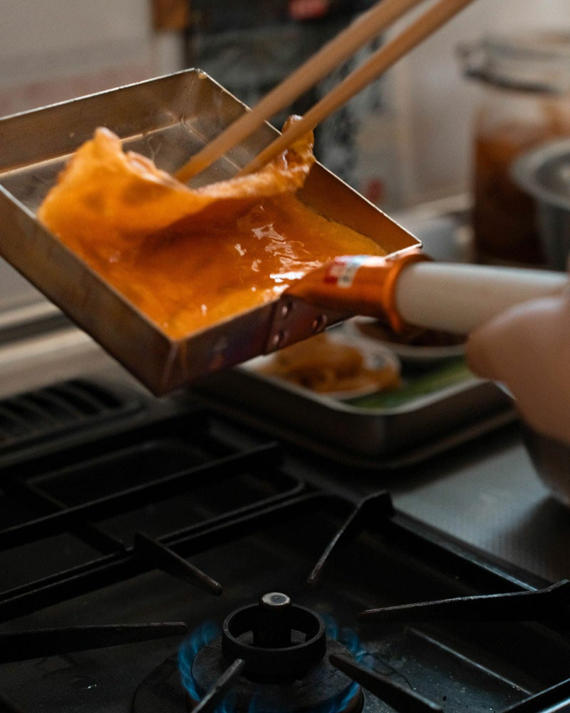 この錫の層が、銅の熱をほんの少し和らげてくれるおかげで、鍋全体がじんわりとあたたまり、玉子にもふっくらと均一に火が入ります。