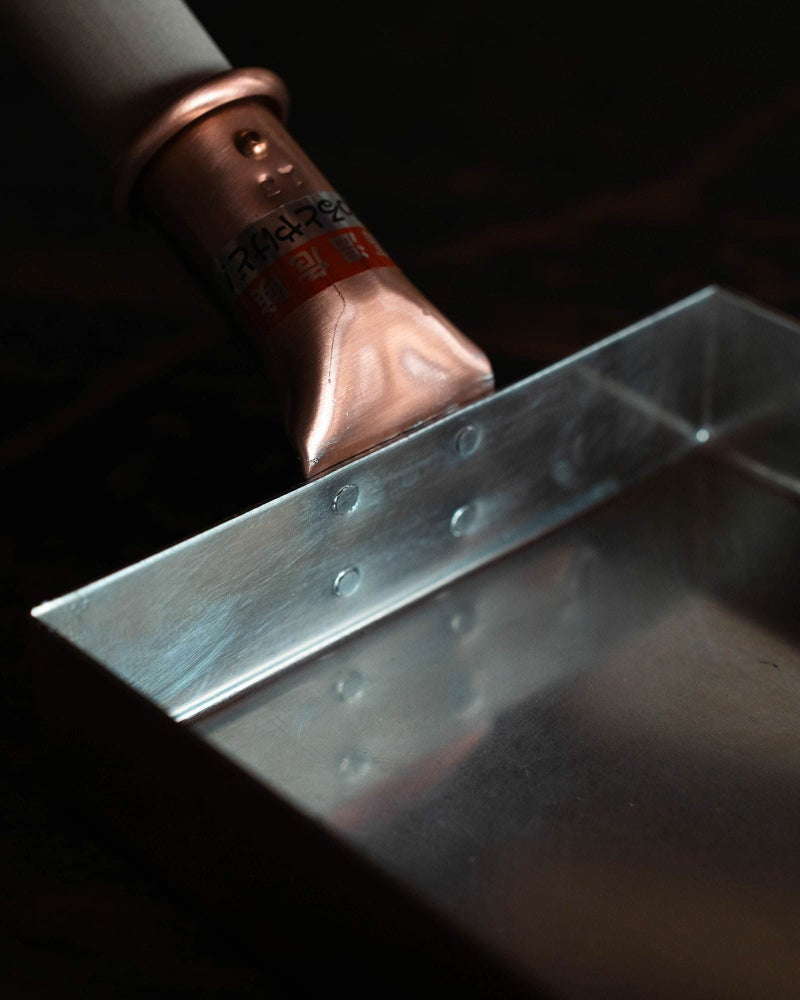 高温で熱した銅板に手作業で錫を焼き付けるため、温度管理・塗りムラの調整など、すべてが職人の腕にかかっています。