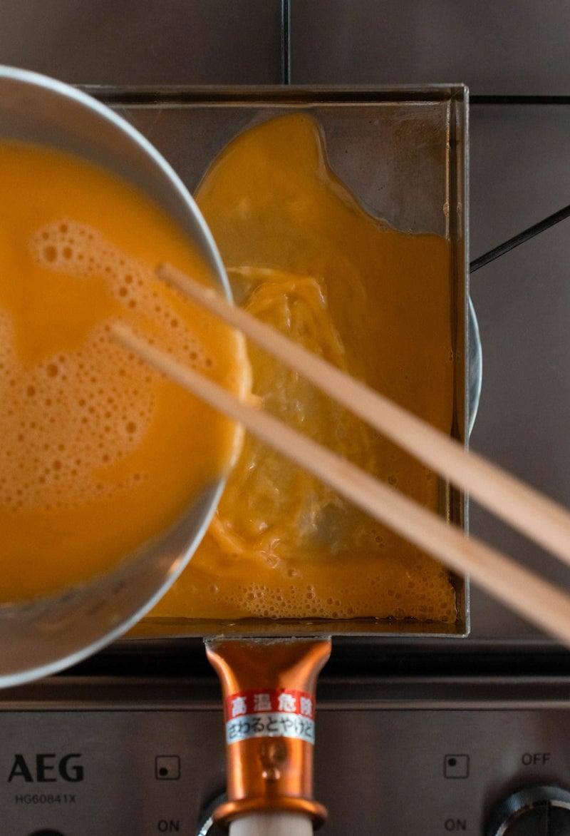 A.一般的に西型はだし多め、一度に投入する卵液の量は少なめで、回数を重ねて巻き上げます。東型は甘めでだしは無しか少なめ。一度にたっぷりの卵液を入れることが多く、中に鰻や穴子などの具を入れるのにも向いています。