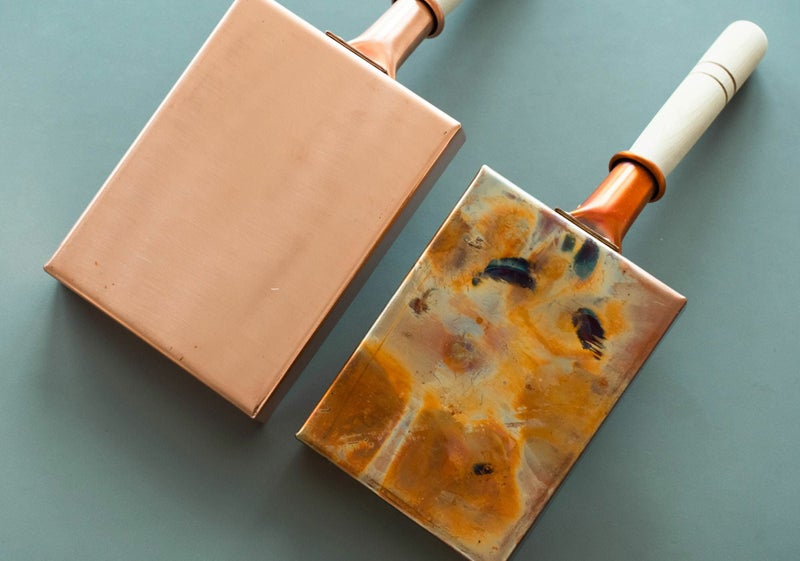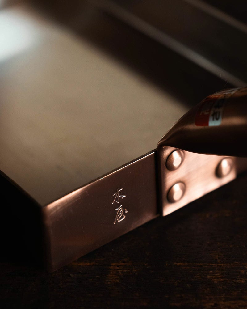 高温で熱した銅板に手作業で錫を焼き付けるため、温度管理・塗りムラの調整など、すべてが職人の腕にかかっています。