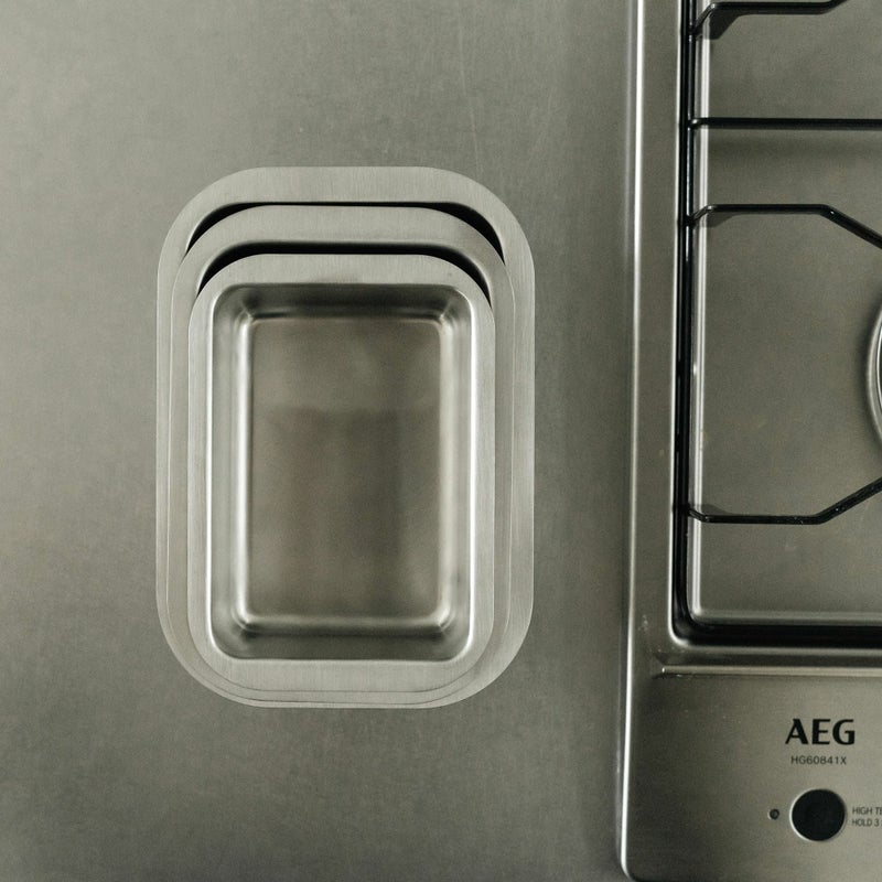 同じサイズを重ねられるのはもちろんですが、大きいサイズのセットの中にはそれぞれ小さいサイズがすっぽりと収まるので、収納サイズは最低限で済みます。