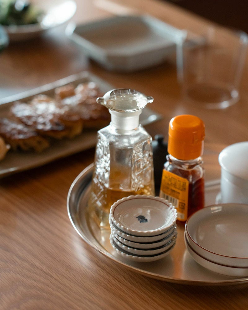 タレ入れ:春菊 招き猫 / 醤油差し:醤油差し / お酢:復刻 醤油差し(籠目) / 醬:キャニスター 小・キャニスター 蓋/取り皿:丸鏡 五寸 赤輪 / お盆:お盆 真鍮銀めっき 小