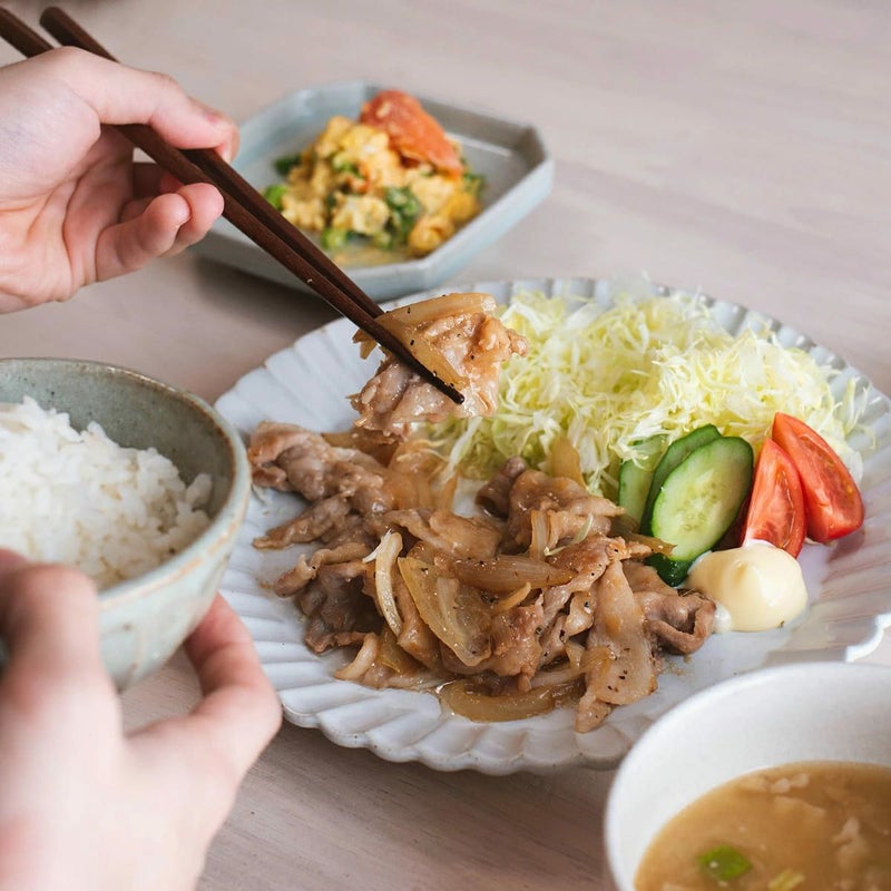 豚の生姜き: バルバリ メインプレート(ブラン) / ほうれん草の胡麻和え:オルス 160プレート(アイスブルー) / 白米:デイジー 茶碗L(灰色) / 豚汁:エブリデイ 汁碗(白) / 卵とトマトの炒め物:ペイヴ 4.5寸皿(青磁) / お箸:(栗皮色)