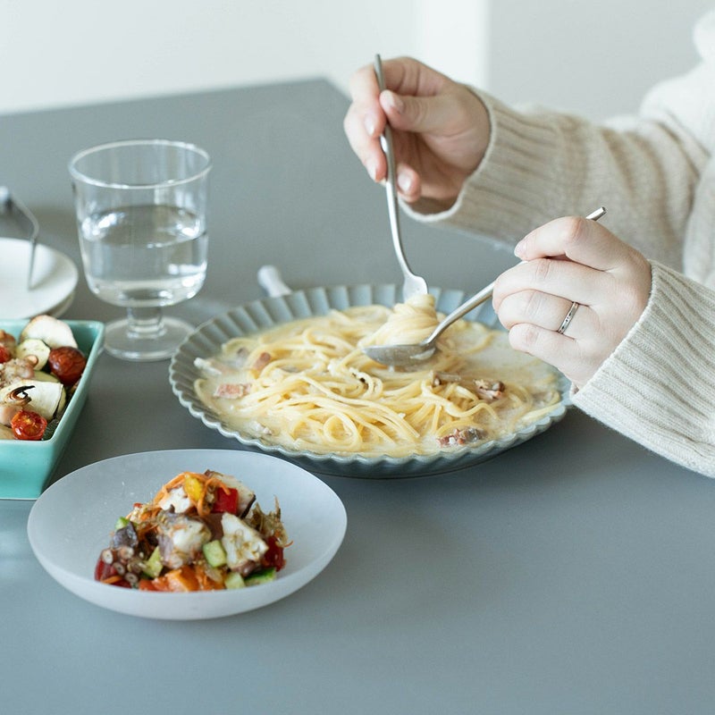 メインプレートは直径25cmですがリムが全体の2、3割を占めているので意外にも最も汎用性の高いサイズ。シンプルに焼いたお肉を置いただけでワンランク上のご馳走にしてくれるので、お皿単体で見た時に受けた派手なイメージの割にかなり食卓での登場頻度は高めです。