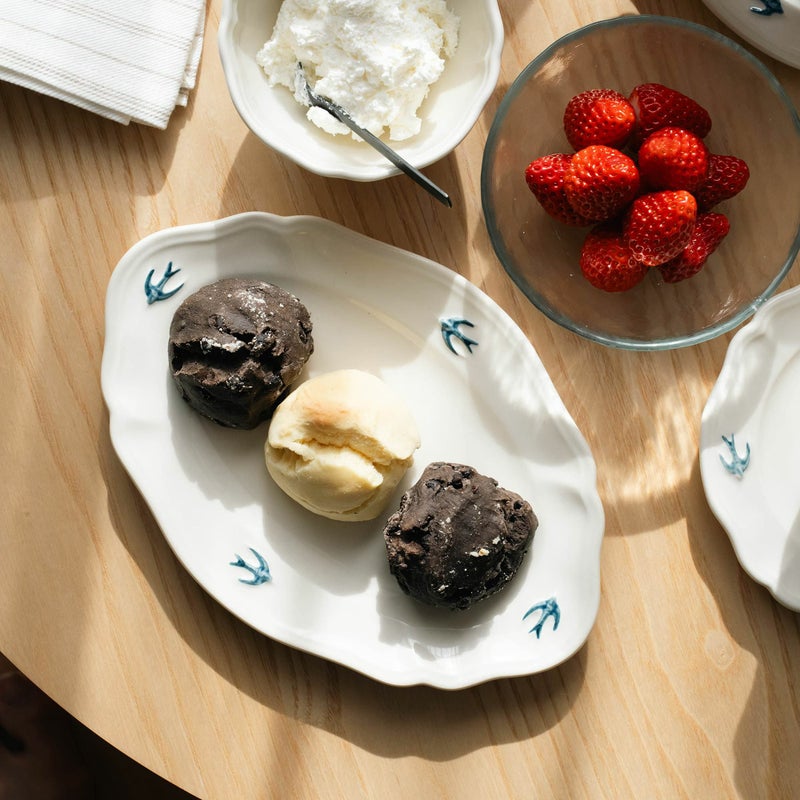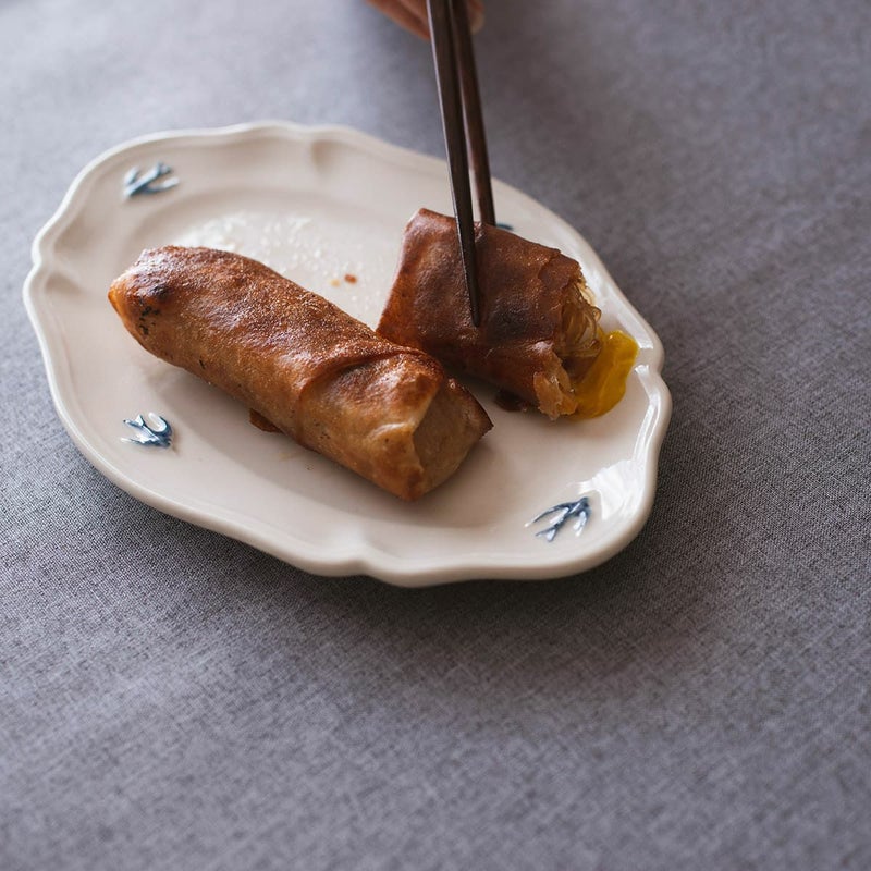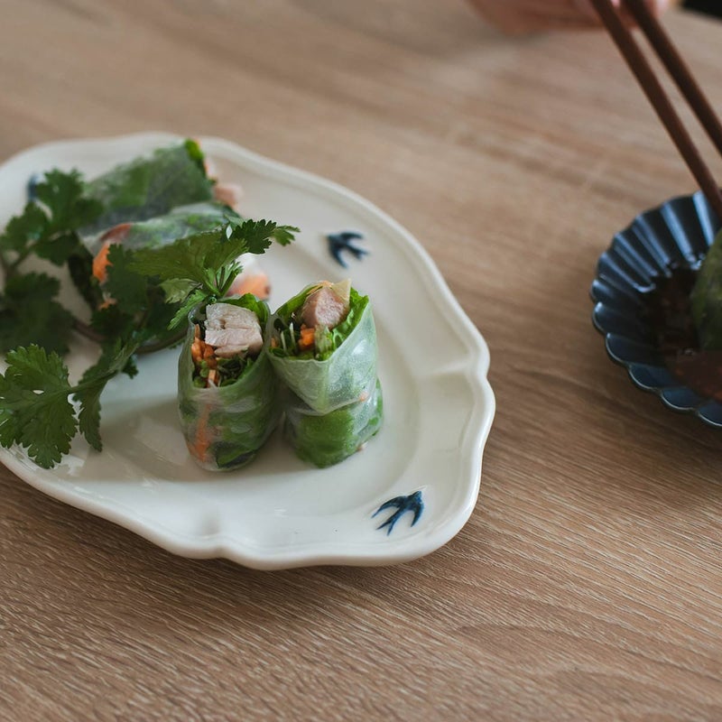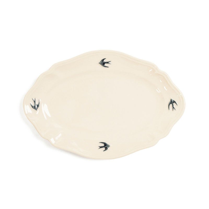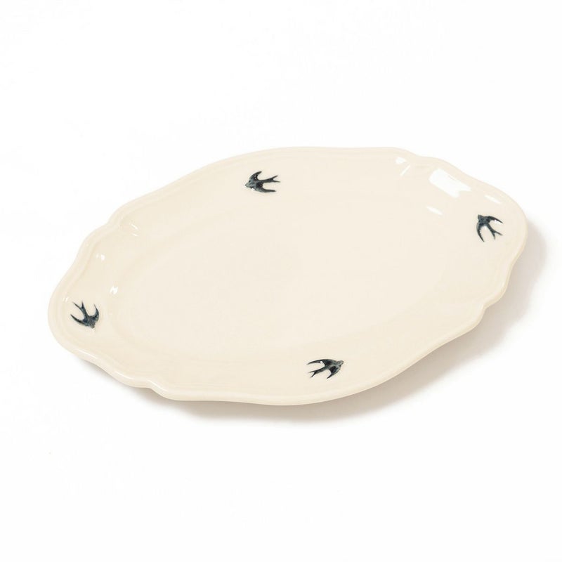 やわらかなアイボリーがかった白磁に、飛び立つツバメのワンポイントが映え、食卓に優雅な雰囲気を添えてくれます。
