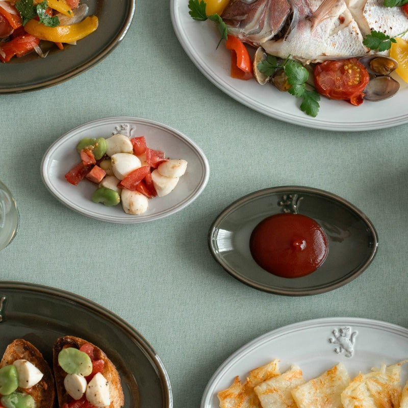 アクアパッツァ・ブスルケッタ:マルタ 280オーバルプレート(オリーブ・ブラン) /じゃがいものガレット・グレフルとパプリカのマリネ:マルタ 230オーバルプレート(オリーブ・ブラン) / カプレーゼ・ケチャップ:マルタ 130オーバルプレート(オリーブ・ブラン) / 枝豆のポタージュ:マルタ マグカップ(オリーブ・ブラン)