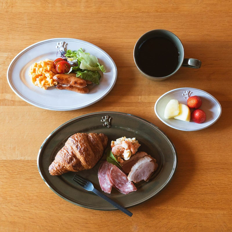 ワンプレート:マルタ 280オーバルプレート(オリーブ) / おかず:マルタ 230オーバルプレート(ブラン) / 果物:マルタ 130オーバルプレート(ブラン) / 珈琲:マルタ マグカップ(オリーブ)