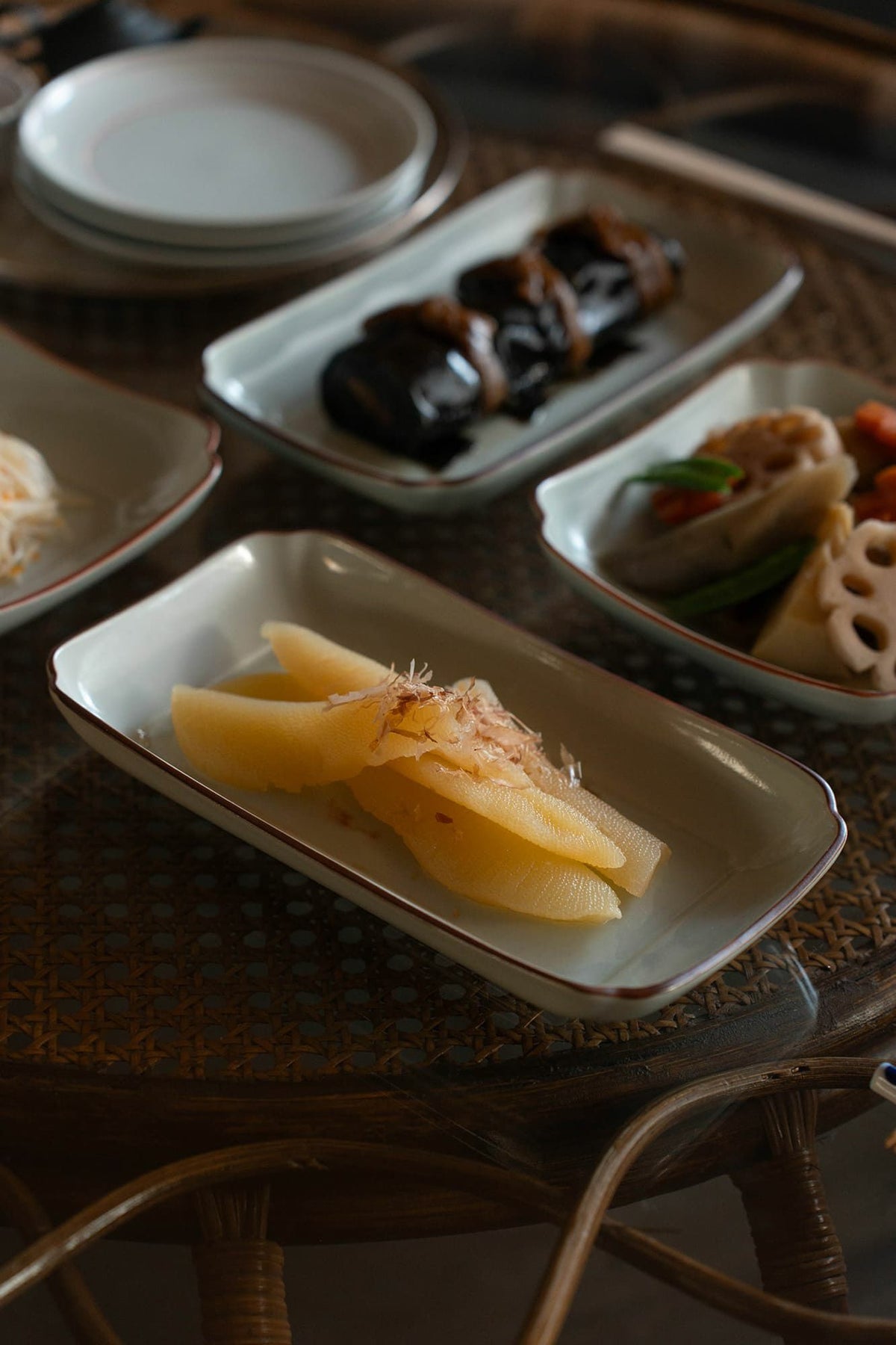 焼き魚や玉子焼き、焼きナスといった縦長の料理はもちろん、小ぶりのおかずも長角に盛れば薬味や付け合わせを添える余裕が生まれる。