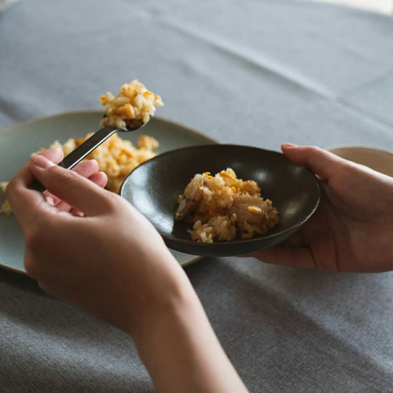 炒飯:オルス 270プレート(アイスブルー) / 取り皿:オルス 150ボウル(ダークグレー) / スプーン:フリシティブラック スプーンL