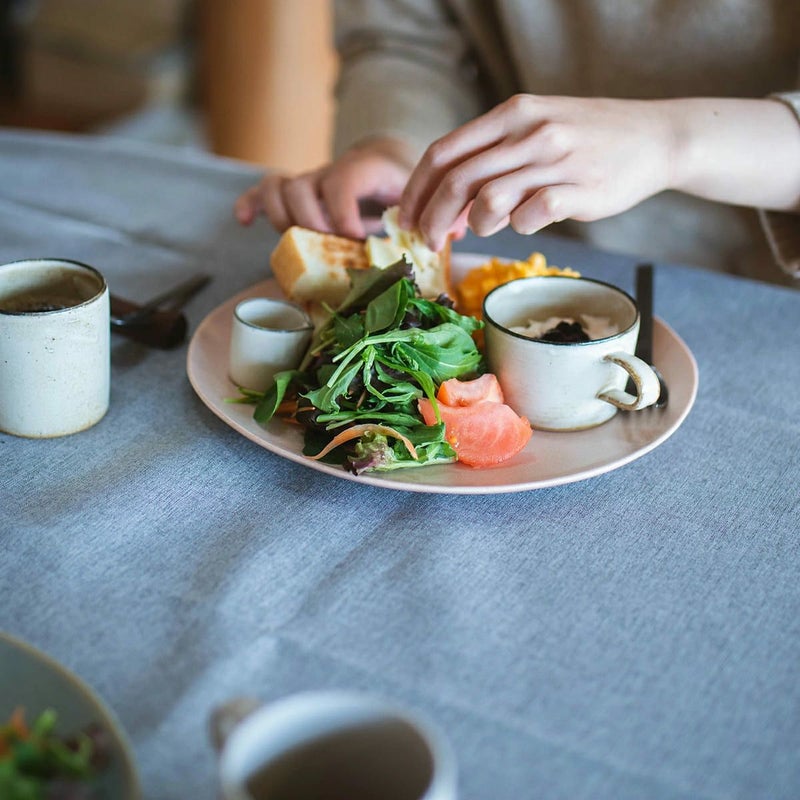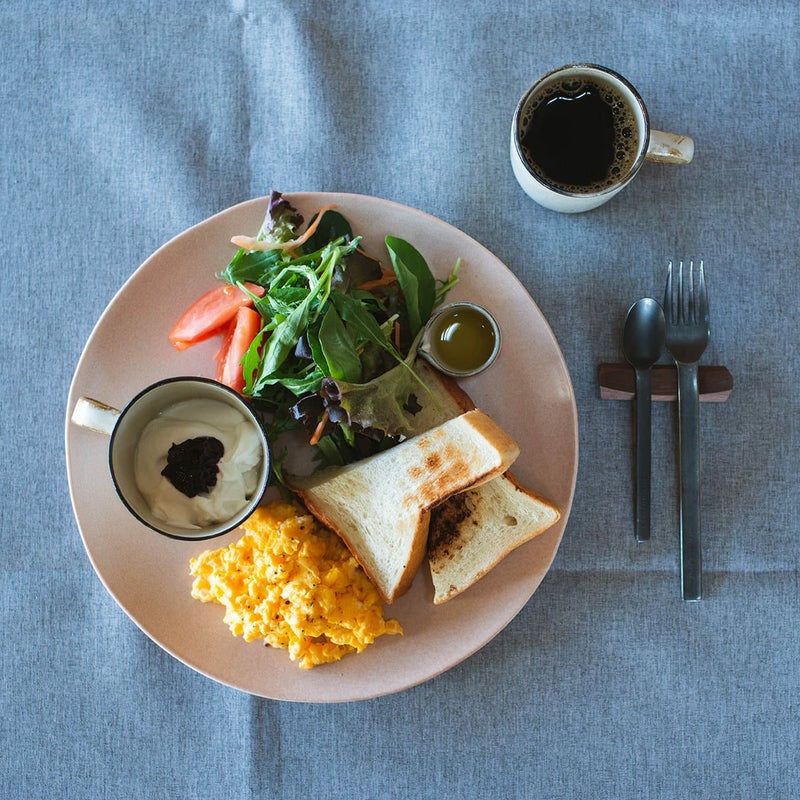 モーニングプレート:オルス 270プレート(シェルピンク) / ヨーグルト:ブロウ マグ(台形) / 珈琲:ブロウ マグ(切立) / ドレッシング入れ:ブロウ ミルク / フォーク:フリシティブラック フォークM / スプーン:フリシティブラック スプーンM