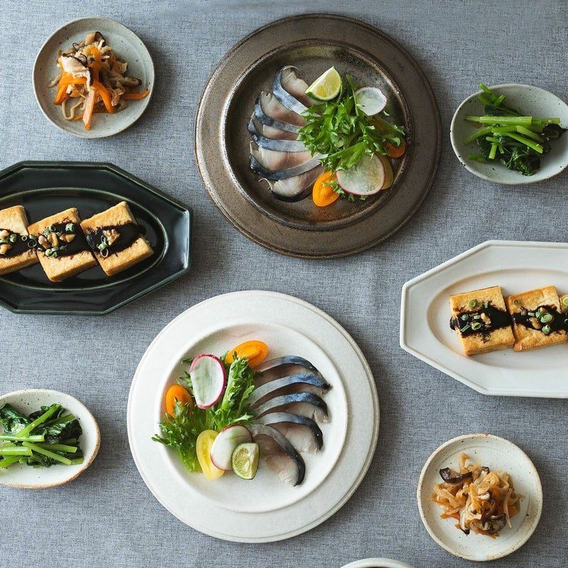 鯖の燻製刺身:オルト 235プレート(グレイッシュホワイト・ブロンズ) / 厚揚げの味噌がけ:トレトゥール プレートM(白・濃藍) / 小松菜のお浸し:だ円小鉢S(おこげ・灰) / 切り干し大根の煮物・たたら 切立皿10cm(おこげ・灰)