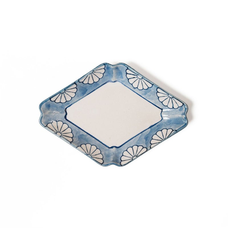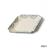 古風な菊花模様が絵付けされた隅入菱形皿は上品ながら、焼成の際に生じる鉄粉混じりの土が温かみや素朴さを与え、親しみやすさを感じます。