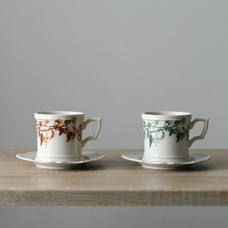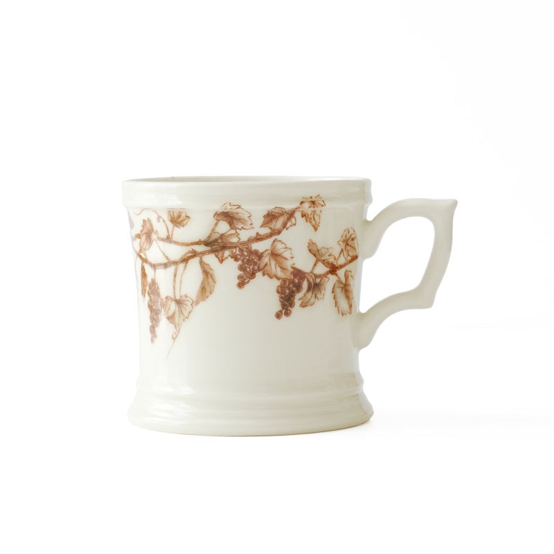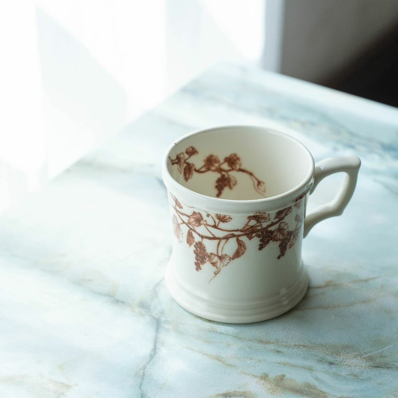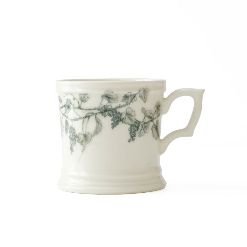 マグカップの柄は、口元の上部から葡萄の枝と果実が垂れ下がるように配置することで、あまり重い印象にならないよう工夫が施されているとか。