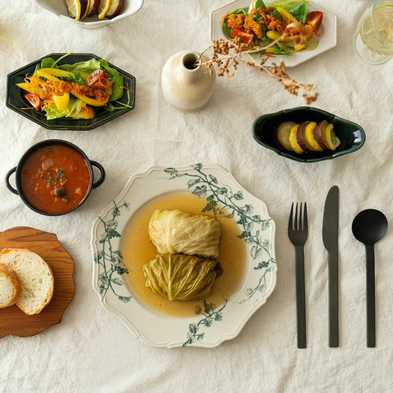 ロールキャベツ:ヴィーニュ ラウンドプレート L(ブルー) / パン:フローラートレイ L(杉)/ ミネストローネ:ブロウ スープカップ(ノワール) / さつまいものレモン煮:トレトゥール ボウルS(濃藍) / 生野菜サラダ:トレトゥール プレートS(濃藍・白) / 白ワイン:ガウディ 6oz / カトラリー:フリシティブラック フォークL・フリシティブラック ナイフ・フリシティブラック スープスプーン