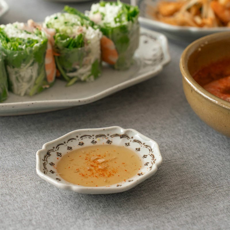一品料理を存分に盛り付けられる余裕があり、横に広がる曲線が料理の彩りを引き立て、餃子の香ばしい焼き目や生春巻きの瑞々しい艶などをより美しく見せてくれます。
