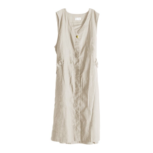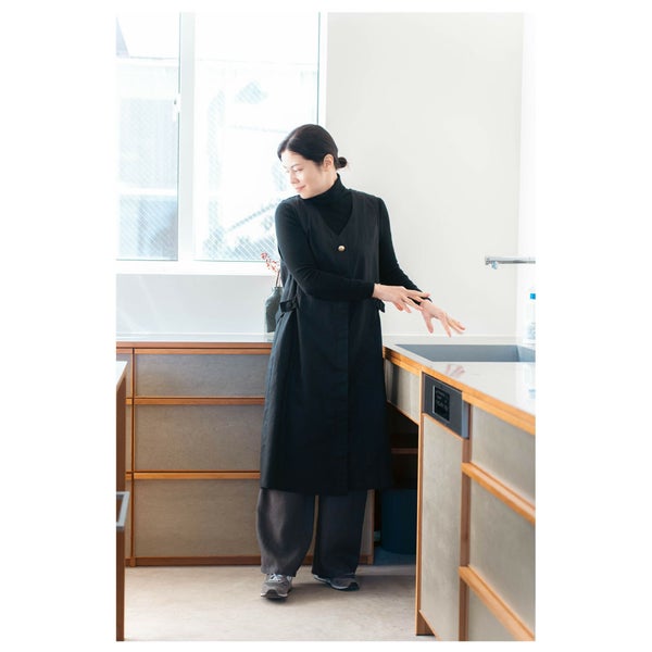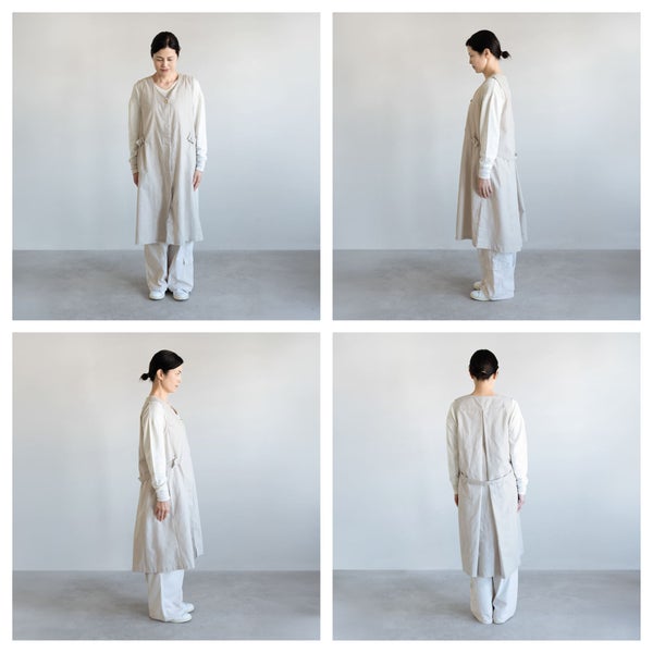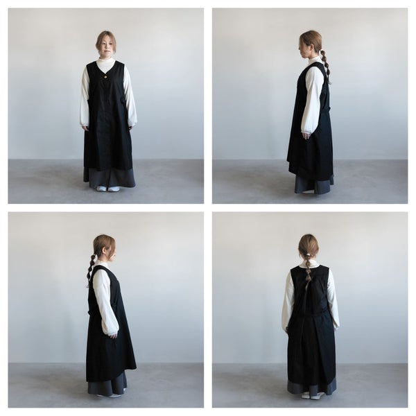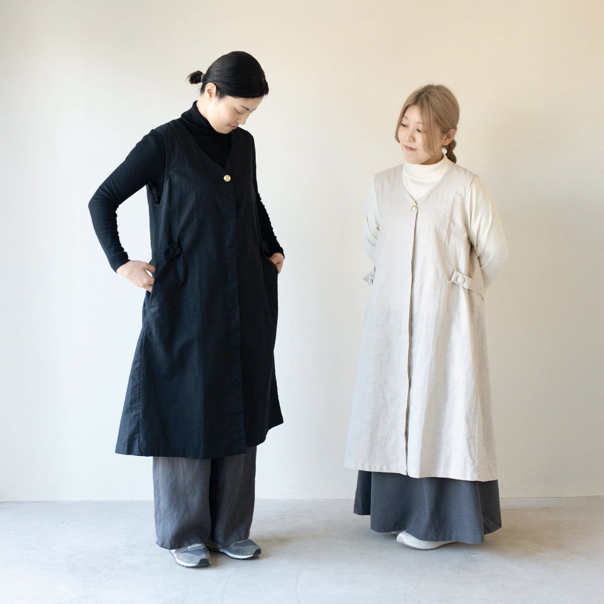 リネンのやわらかく落ちる質感を活かした、すとんとまっすぐなシルエットは、ジャンパースカートのような感覚で、そのまま外に出られる装いを意識しました。