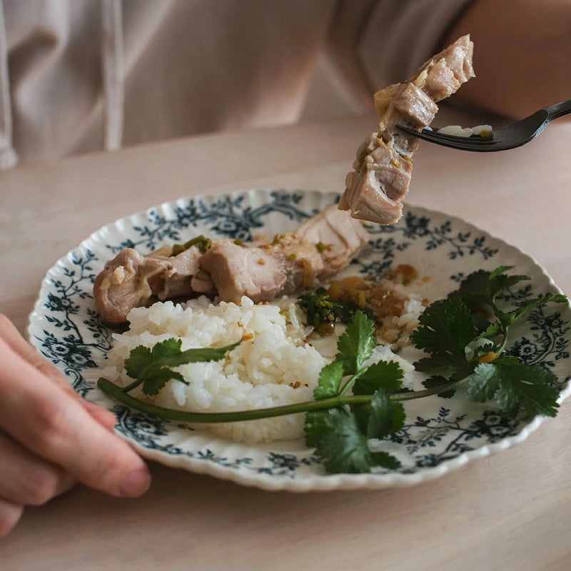 カオマンガイ:オードリー 200プレート(インディゴ) / パクチーサラダ:レカ 180ボウル(白) / 取り皿:バルバリ コガモプレート(グリス・ブラン) / 麦茶:ココン マグカップ(エクリュ・スミレ) / フォーク:フリシティブラック フォークL