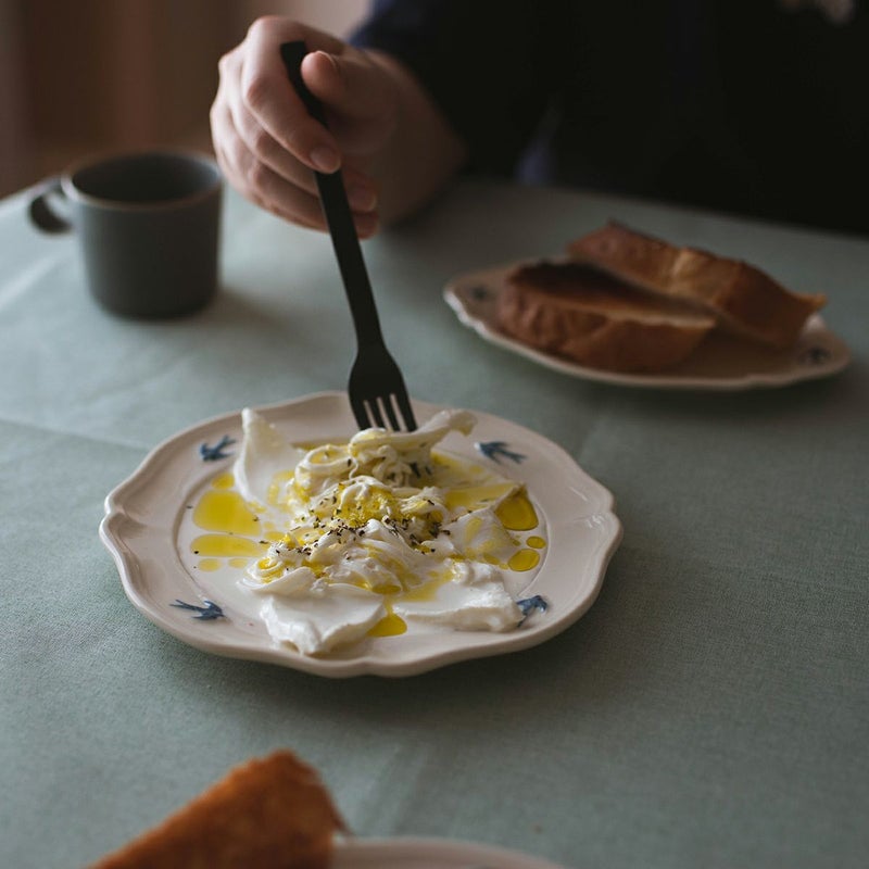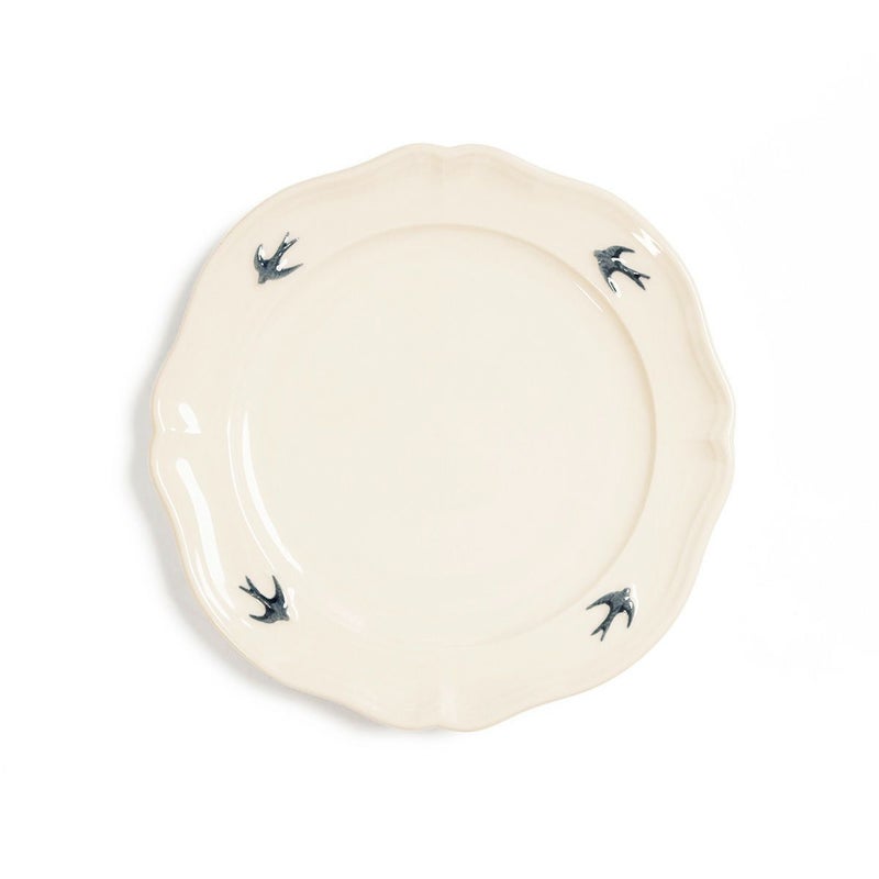 やわらかなアイボリーがかった白磁に、飛び立つツバメのワンポイントが映え、食卓に優雅な雰囲気を添えてくれます。